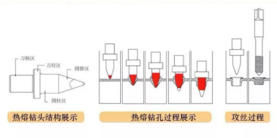 上圖很好的展示了熱熔鉆孔攻絲的整個加工過程,通過特殊處理過的熱熔鉆頭,在高速旋轉接觸到金屬材料表面的瞬間,會產生600℃-800℃的高溫,高溫軟化金屬的同時,高速主軸帶動熱熔鉆頭快速旋轉下壓,被擠壓的那部分金屬沿著圓孔朝上下延伸,形成比原金屬厚度三倍左右的厚壁層。熱熔鉆孔的整個加工過程不會破壞金屬材料的結構和性能,同時形成的厚壁層具有抗扭力/拉力的性能,可以直接進行高質量的無屑攻絲。